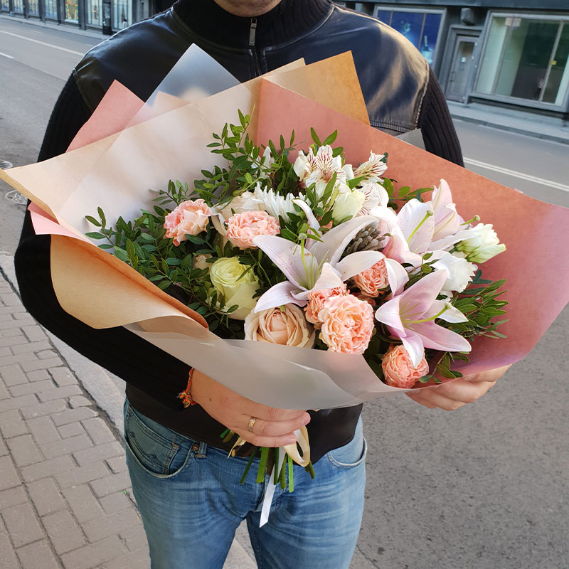 | Состав | Гортензии, Ирисы, Кустовые розы, Лилии, Розы, Хризантемы |